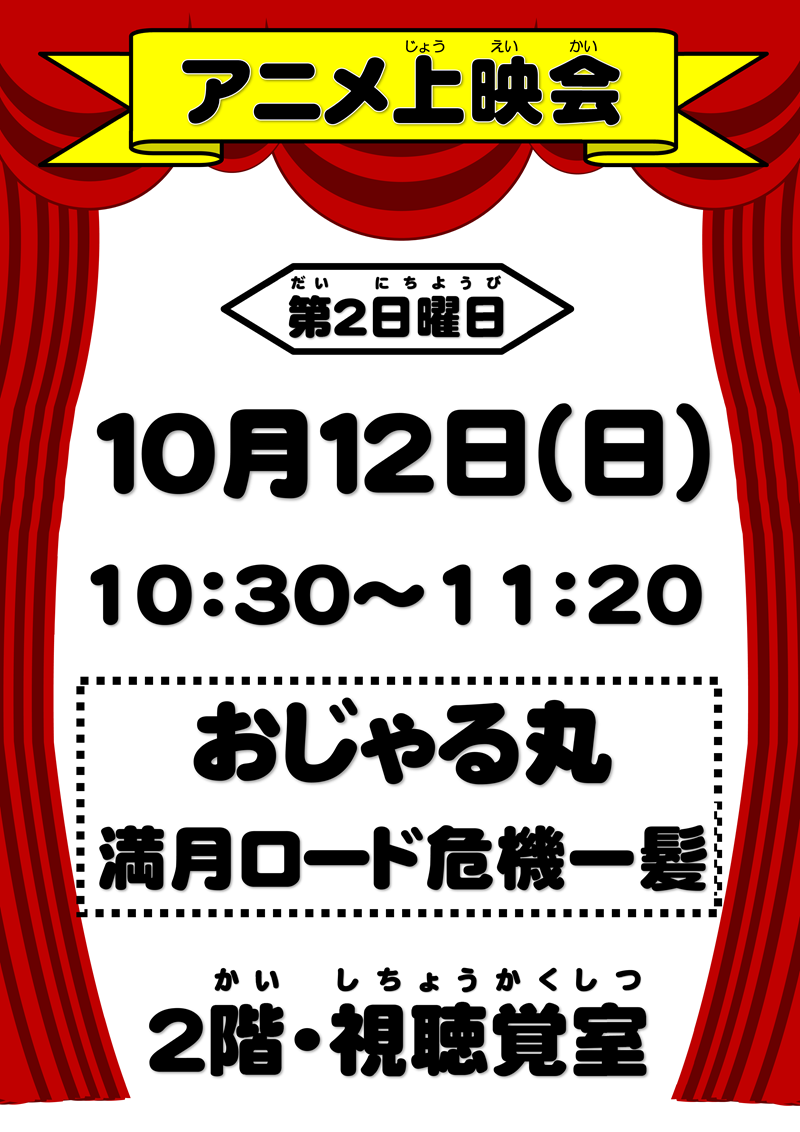 ホーム > イベント情報 > アニメ上映会「おじゃる丸 満月ロード危機一髪」(令和7年10月12日(日)午前10時30分~11時20分)