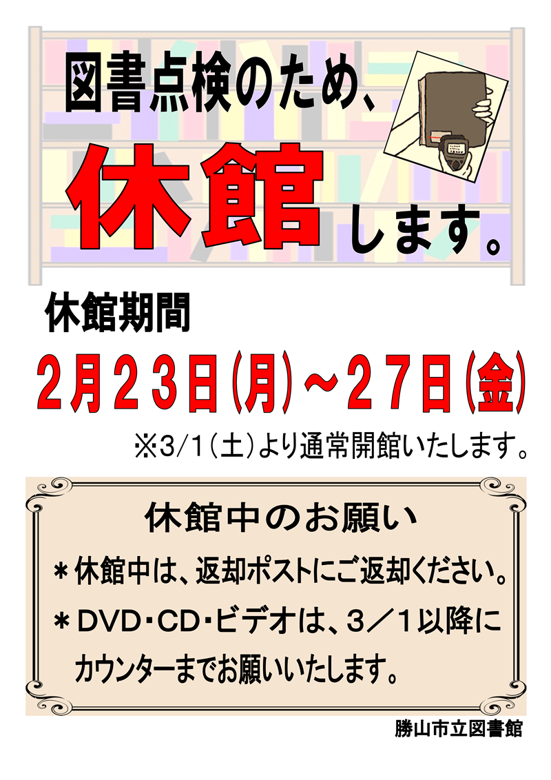 ホーム > 【重要】図書点検のため休館します(2/23(月)~ 27(金))