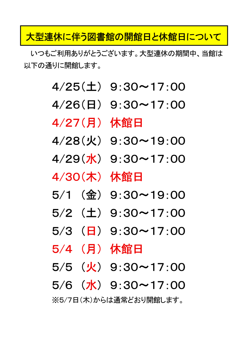 【重要】大型連休に伴う図書館の開館日と休館日について