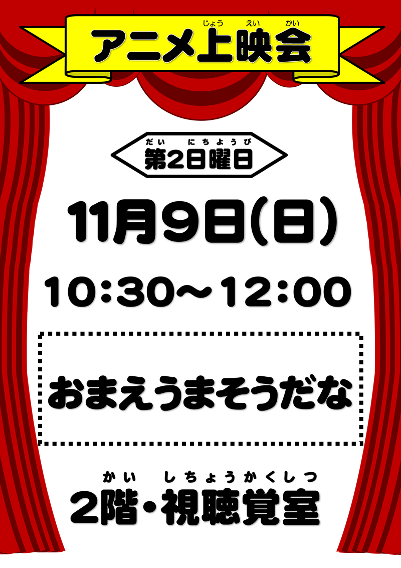 ホーム > イベント情報 > アニメ上映会「おまえうまそうだな」(令和7年11月9日(日)午前10時30分~12時)