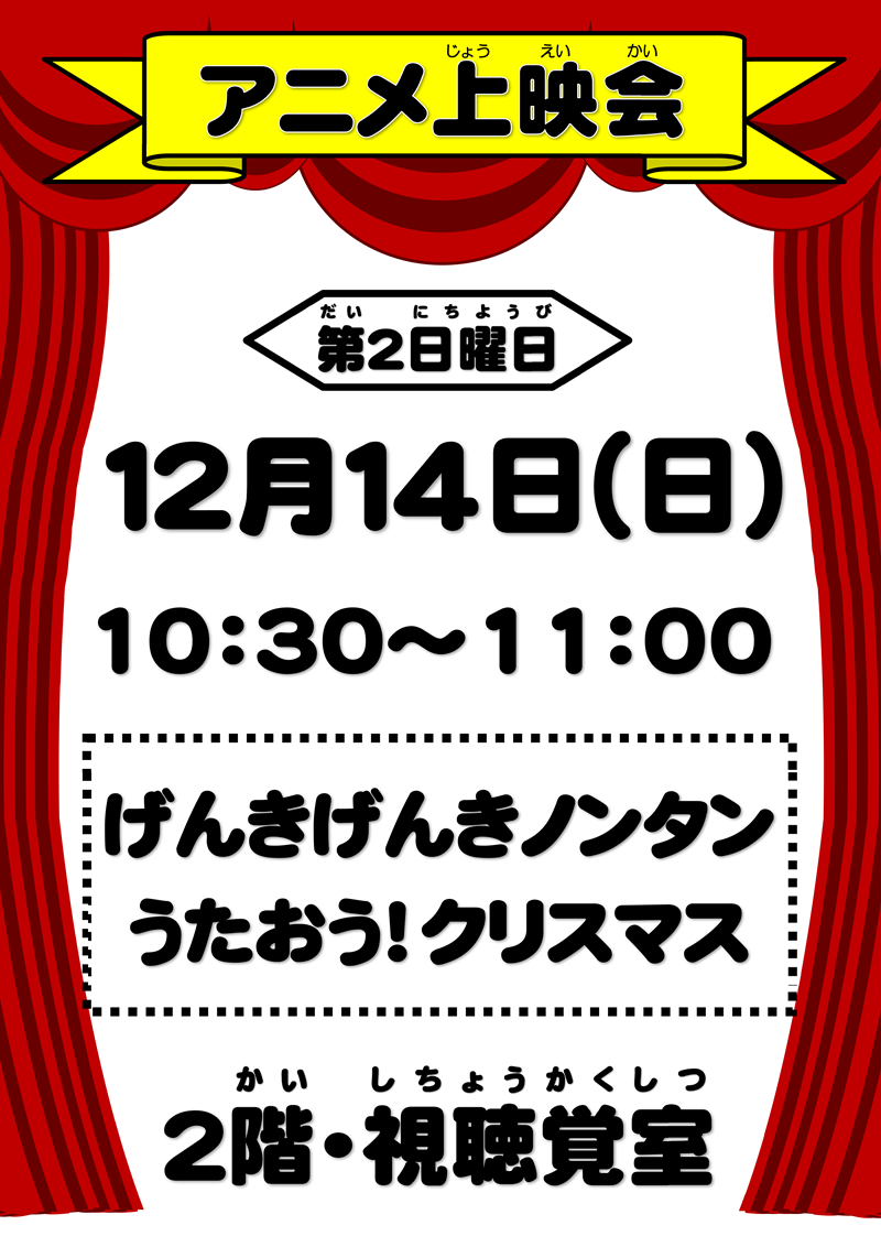 ホーム > イベント情報 > アニメ上映会「げんきげんきノンタン うたおう!クリスマス」(令和7年12月14日(日)午前10時30分~11時)