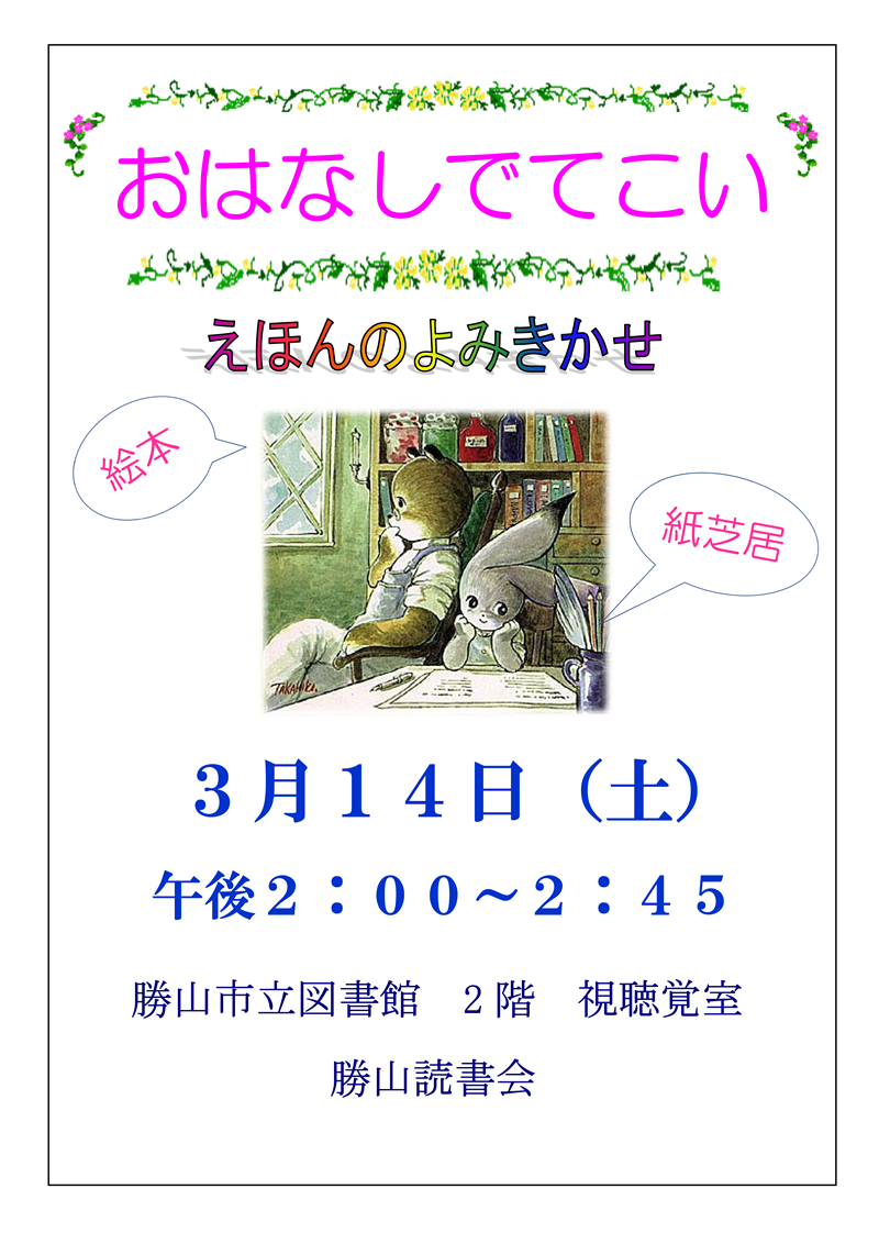 ホーム > イベント情報 > おはなしでてこい(令和8年3月14日(土)午後2時~2時45分)