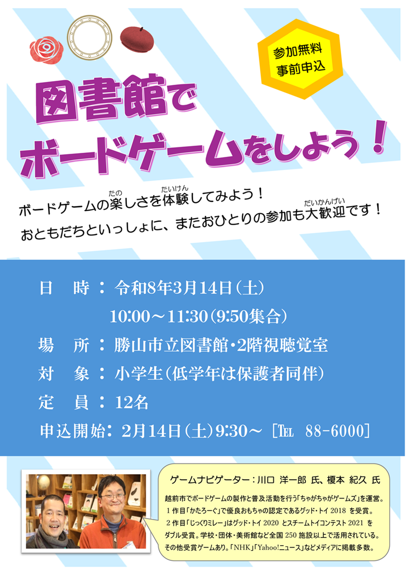 ホーム > イベント情報 > 「図書館でボードゲームをしよう!」(令和8年3月14日(土)午前10時~11時30分)